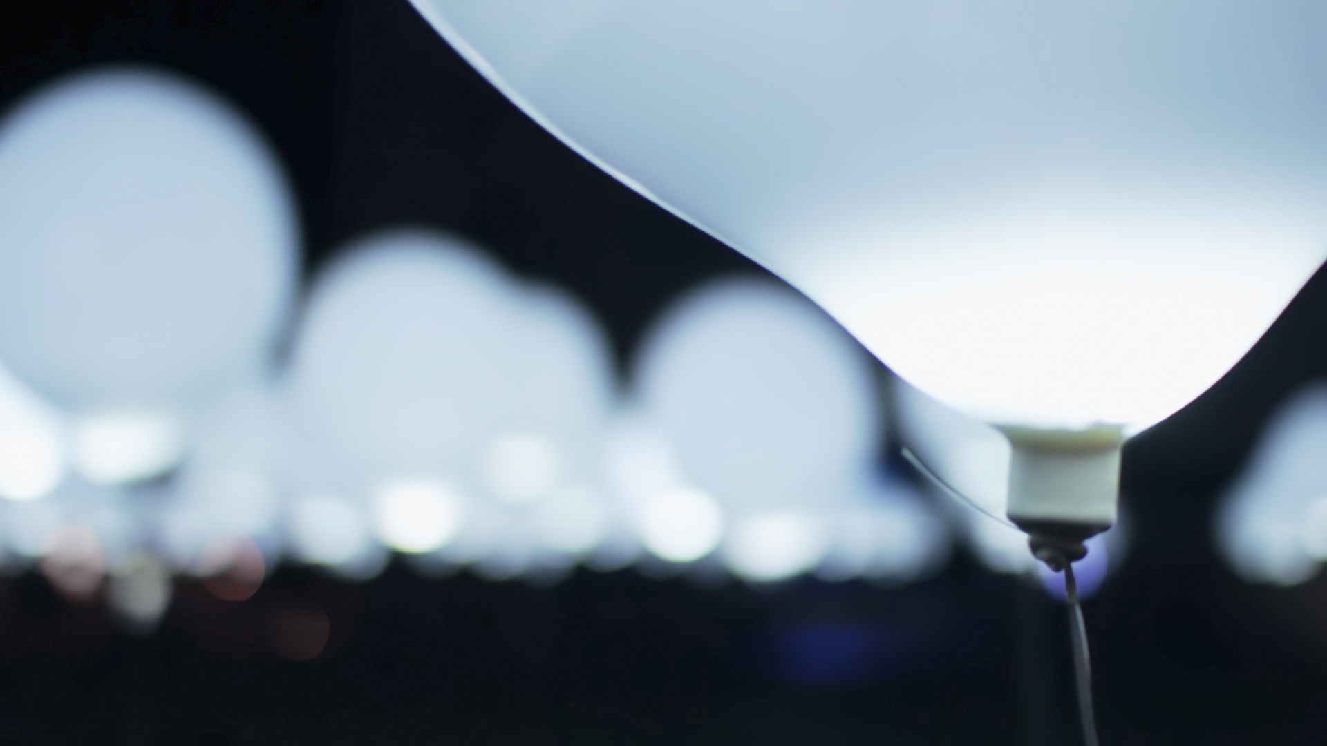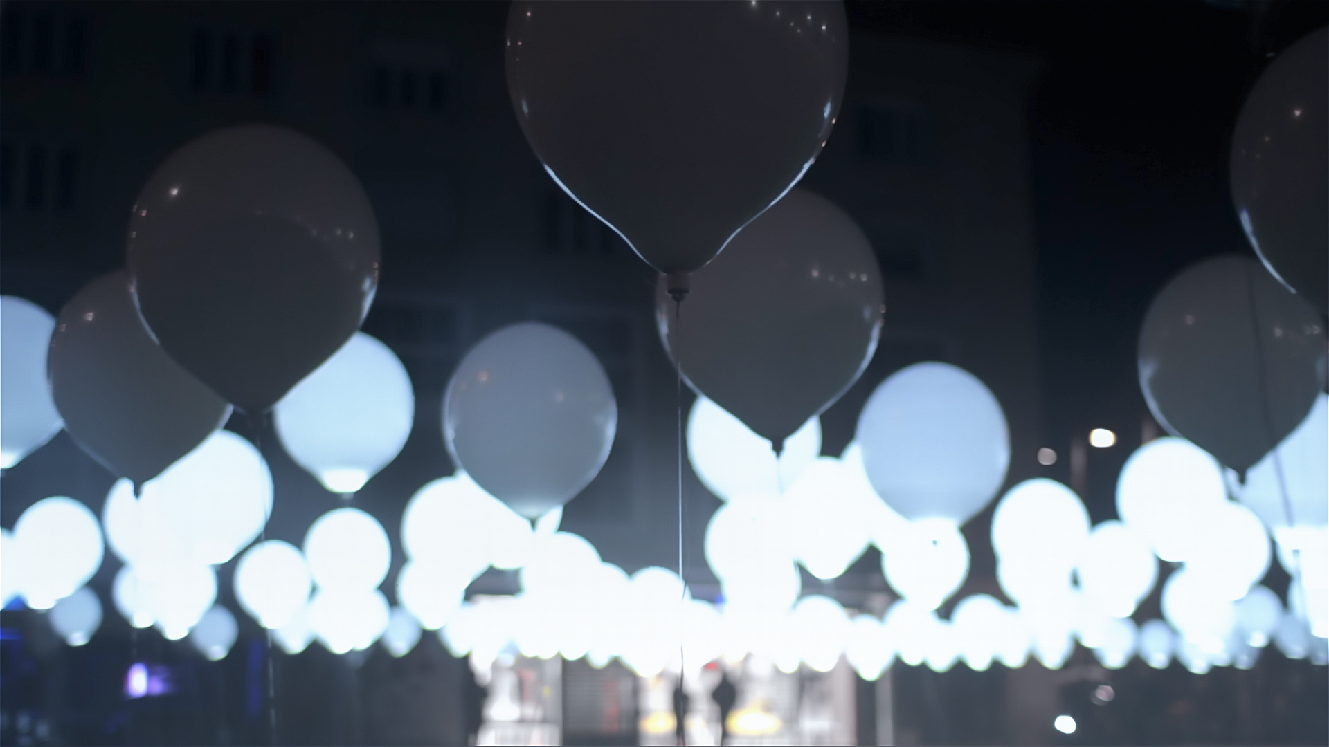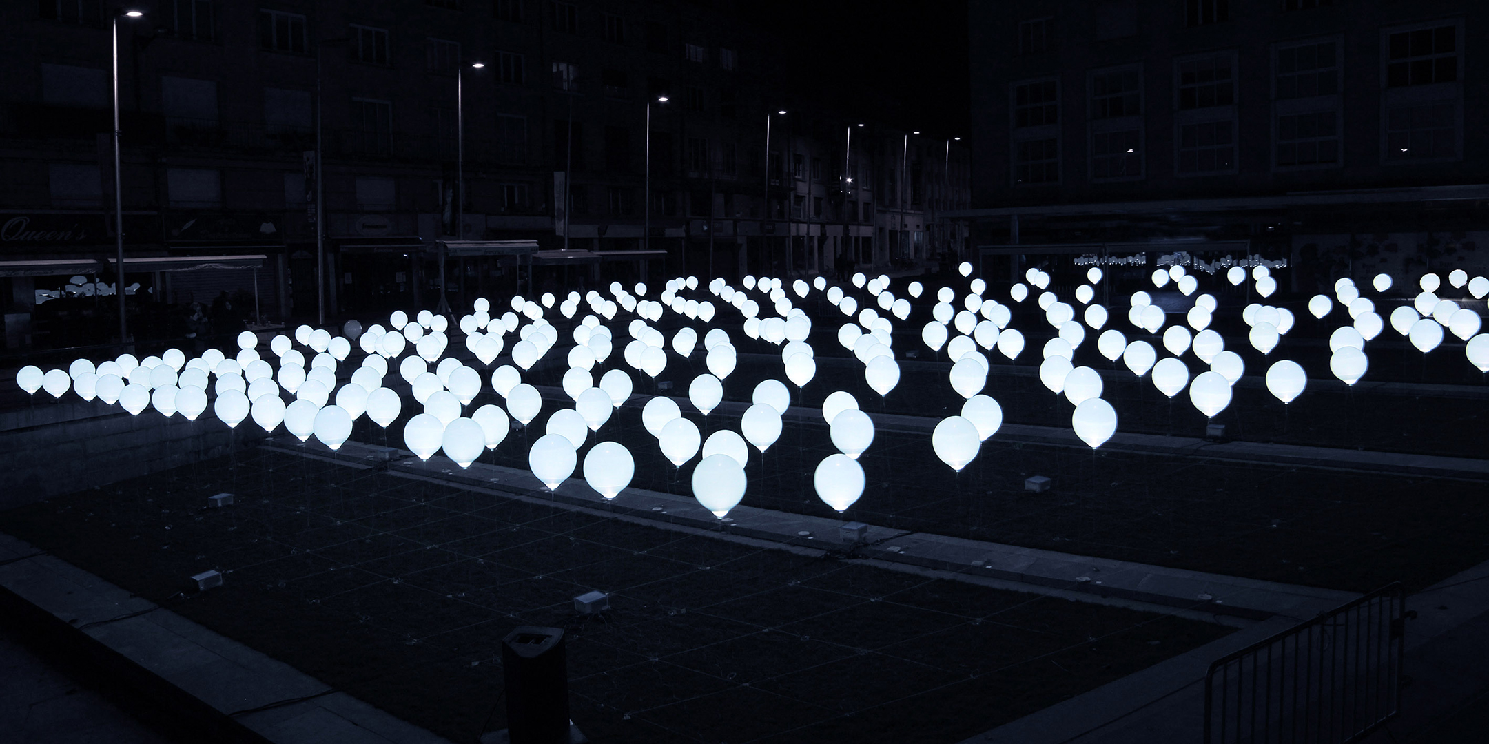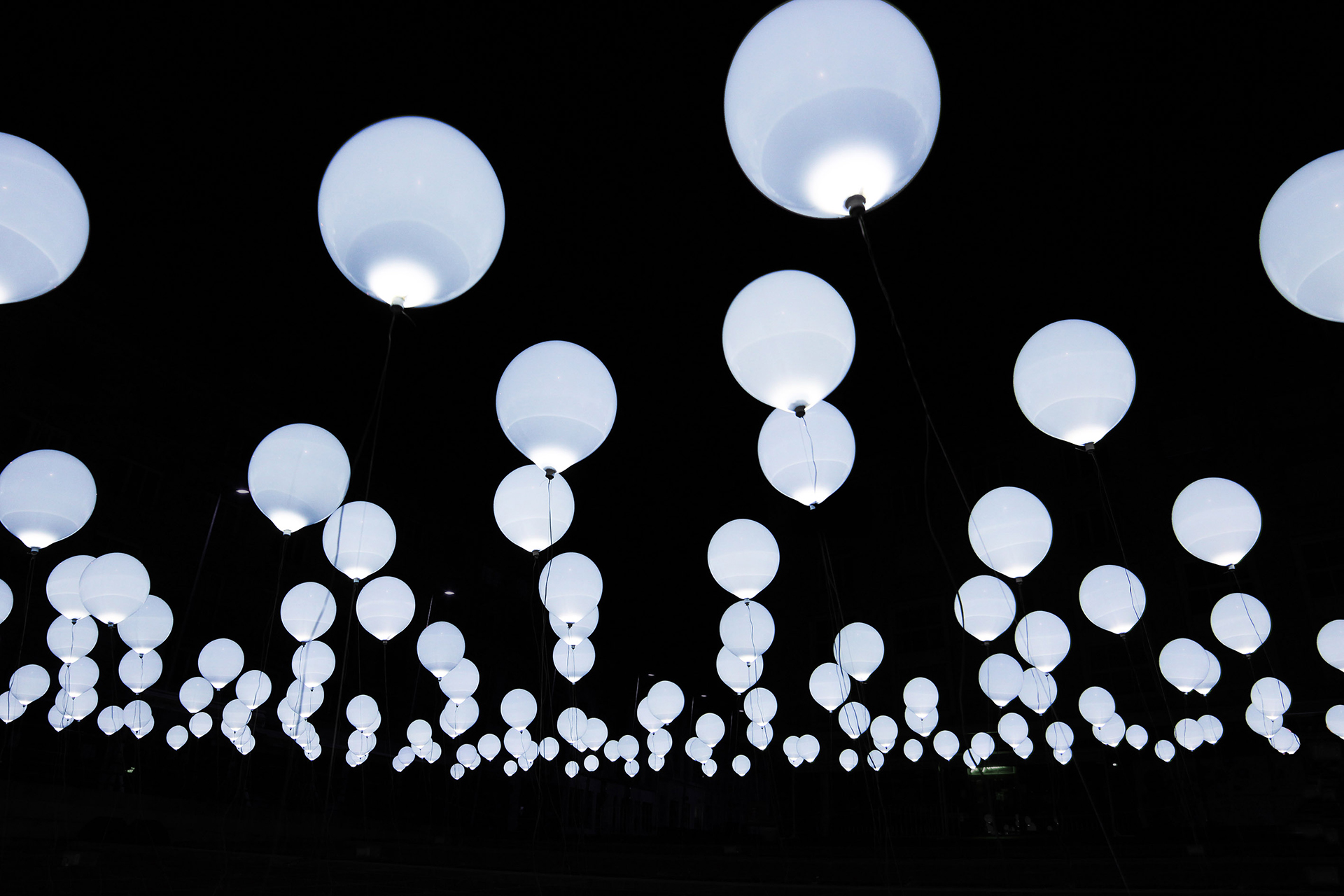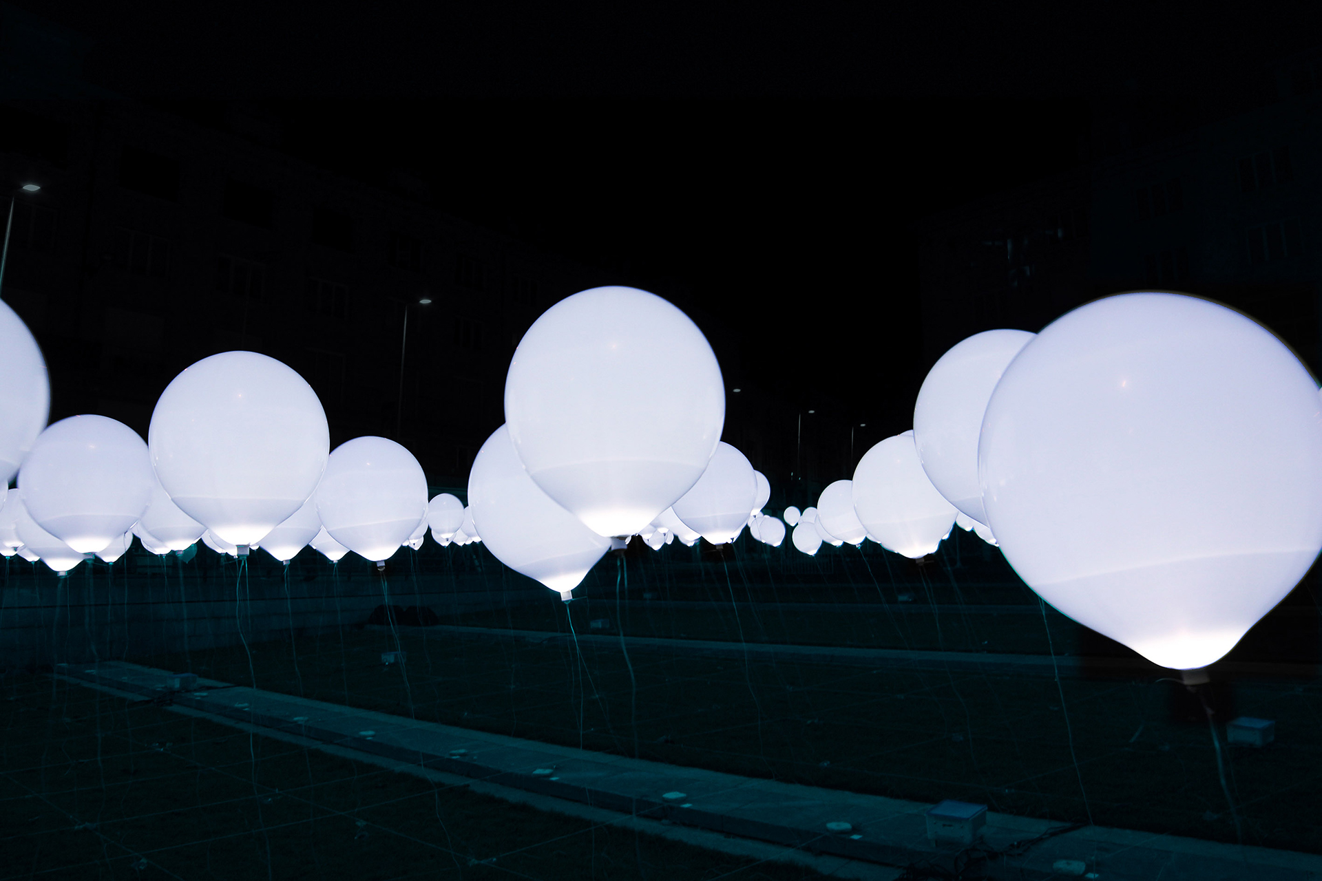 Child Hood est un nuage. Composé d’une multitude de ballons lumineux, il navigue entre minimalisme numérique et installation cinétique monumentale. Il envahit l’espace. Le vent s’engouffre entre les ballons. Comme un ultime interprète, il insuffle une pointe de chaos au sein d’une composition sonore et lumière millimétrée.