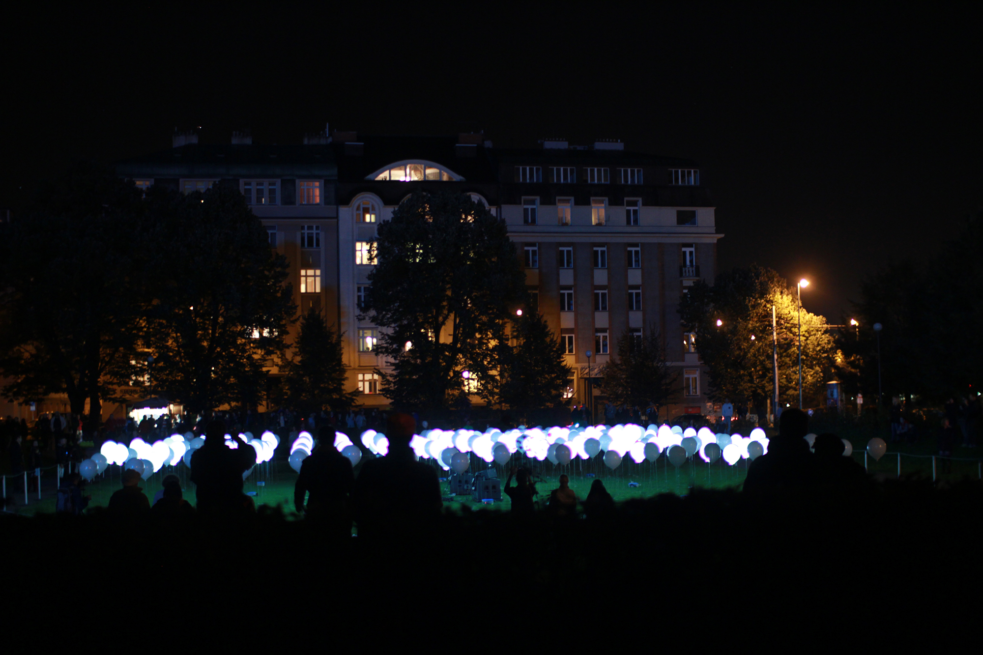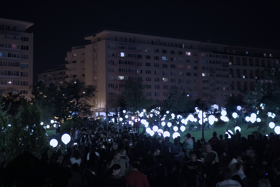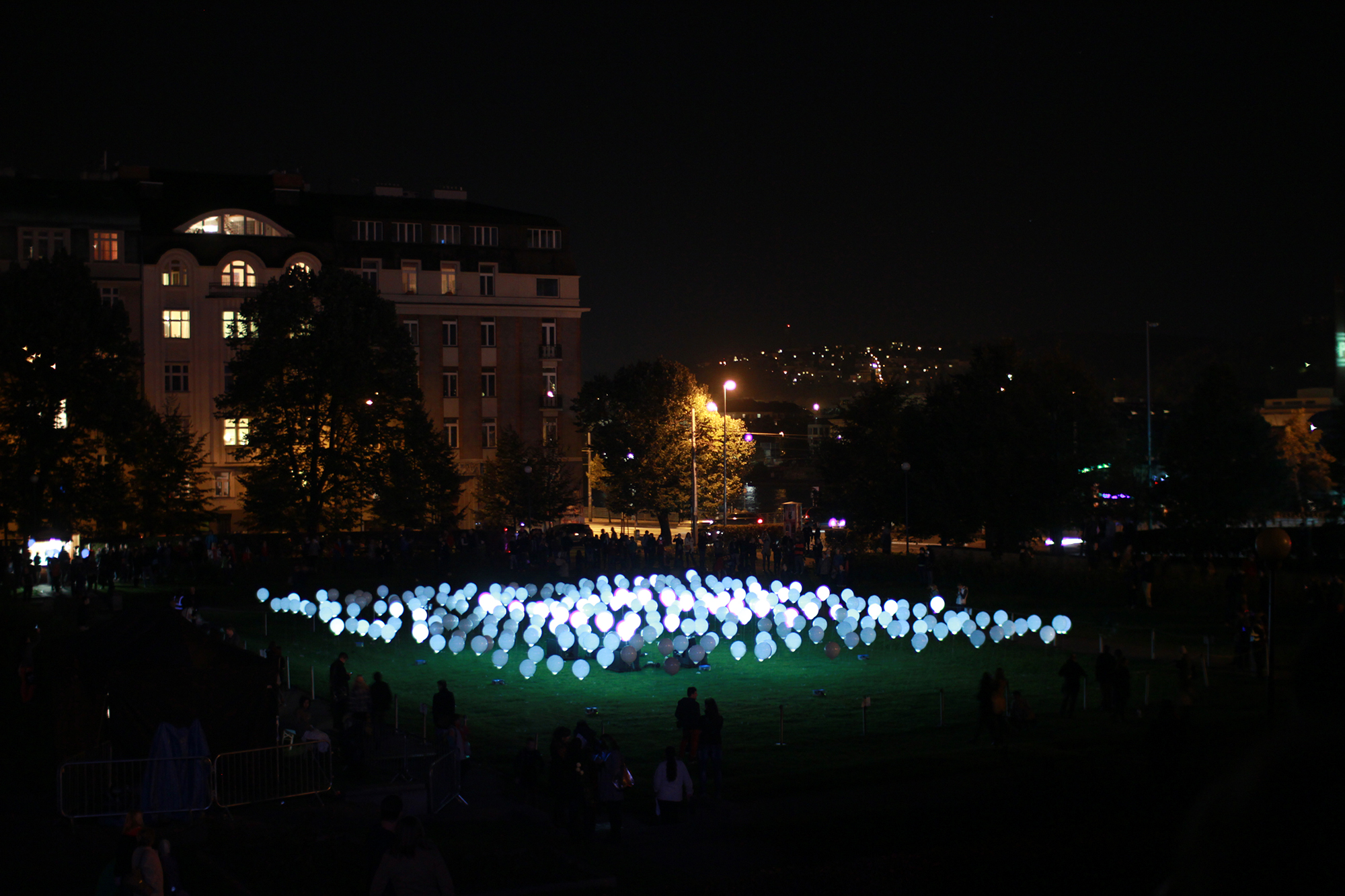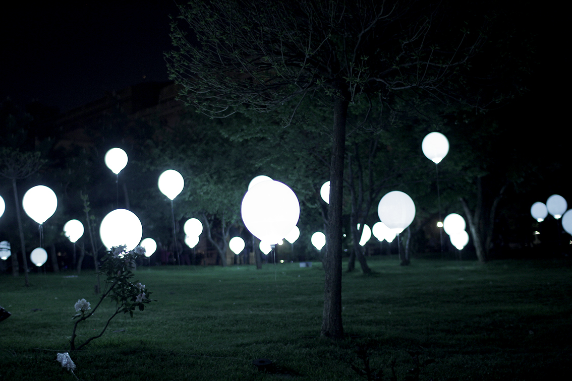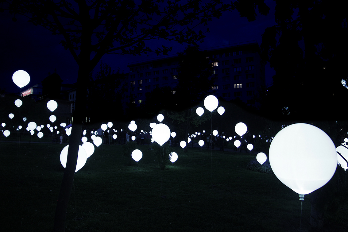 Child Hood est un nuage. Composé d’une multitude de ballons lumineux, il navigue entre minimalisme numérique et installation cinétique monumentale. Il envahit l’espace. Le vent s’engouffre entre les ballons. Comme un ultime interprète, il insuffle une pointe de chaos au sein d’une composition sonore et lumière millimétrée.